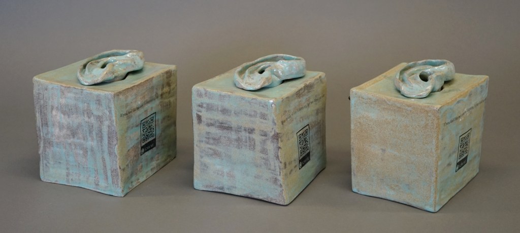 When making these boxes I had the idea to add the ear as the fixture that receives these notes. I made the ear to function like a cap on the box, yet there was a hole through the ear allowing for the notes to fall through. Each box also had a decal transfer that read, “If you feel like no one is listening, let me lend an ear” and a decal transfer of a QR code that connects people to a document listing mental health resources in Thunder Bay and within Canada. Seeing as this interactive piece might invite some serious confessionals; I wanted to ensure that resources were provided. By giving a chance to write what’s on your mind, I am evoking a moment to reflect on those thoughts. In doing so, it feels irresponsible to not offer avenues of support. In addition to the artworks design, I selected a turquoise glaze to represent the topic of Mental Health.
